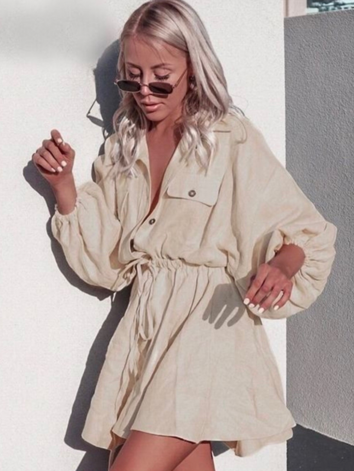 Rochia Loujain, în nuanța bej cu mâneci lungi, inspirată din ultimele tendințe de modă. Potrivită pentru sezonul de vară, această rochie adaugă un plus de eleganță și stil oricărei ținute.